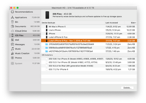 Are you running out of storage space on your Mac? Here's a tip to potentially free up lots of space on your device. Go to Apple menu / About This Mac. There you will see a tab called 'Storage'. Click into that, then click 'Manage'. In there you will see an item on the left called 'iOS Files'. These are the phone backups you may have made to your computer. Chances are there are old and obsolete backups there that can be deleted. There may also be iOS installer files that can be deleted as well. If you are backing up to your iCloud Drive, and desperately need space, you can probably remove all these old backups. Click the relevant backup or update folder and press 'Delete'.